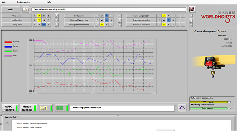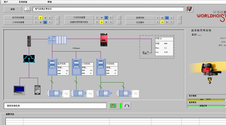 程控制,包括防冲击、电子防摇、寸动、微速等智能控制 安全监控和故障自诊断系统 包括起重机状况监控、故障报警、数字化检修和视频实况