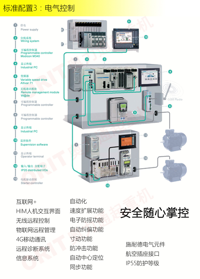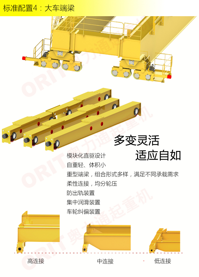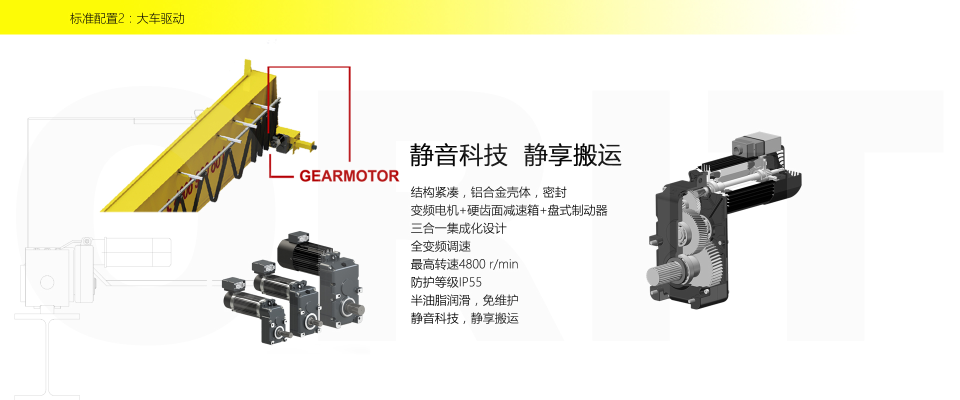 产品名称:大吨位起重机 优化设计,自重轻,轮压小,高度矮 硬齿面柔性驱动,紧凑型结构 变频控制,运行平稳 实时安全监控,确保吊运安全 标准化配置,让性能无比稳定 适用于500t以下双梁起重机 标准配置1:起升机构 颠覆传统,自成一体 SWL(t) HOL(m) 5-500t Max.160m 欧式智能卷扬 高度矮,自重轻,节约建筑成本 重级制,满足持续重载作业 柔性驱动,内应力小,传动效率高 免维护 适配各种吊具 智能化:寸动/微动/电子防摇 故障自诊断系统及HMI 标准配置2:三合一驱动 静音科技,静享搬运 结构紧凑,铝合金壳体,密封 变频电机+硬齿面减速箱+盘式制动器 龙门专用C型三合一集成化设计,节约空间 全变频调速 最高转速4800 r/min 防护等级IP55 半油脂润滑,免维护 静音科技,静享搬运 标准配置3:电控系统 安全随心掌控 智能安全监控器 计算起升机构剩余安全工作时间 累计起升工作时间 累计超载次数 累计起升电机启动次数 起升电机过热保护及报警 刹车片厚度报警 ... ... 远程通讯 施耐德电气元件 航空插座接口 IP55防护等级 互联网+ HIM人机交互界面 无线远程控制 物联网远程管理 4G移动通讯 远程诊断系统 信息系统 自动化 速度扩展功能 电子防摇功能 自动纠偏功能 寸动功能 防冲击功能 自动中心定位 同步功能 标准配置4:端梁 多变灵活,适应自如 模块化直驱设计 自重轻、体积小 多种连接方式,安装尺寸灵活 适用各种厂房,降低厂房高度 QT700车轮,自润滑,更静音 采用调心轴承,适应更自如 应用